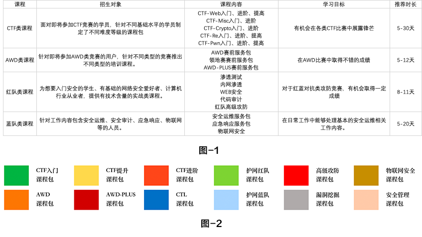 还提供基于已有课程内容的组合包服务,例如针对CTF的初、中、高阶的培训需求,针对常规渗透、高级攻防的需求,以及新兴领域物联网安全的需求等,如图-2就是一些常见的课程包。