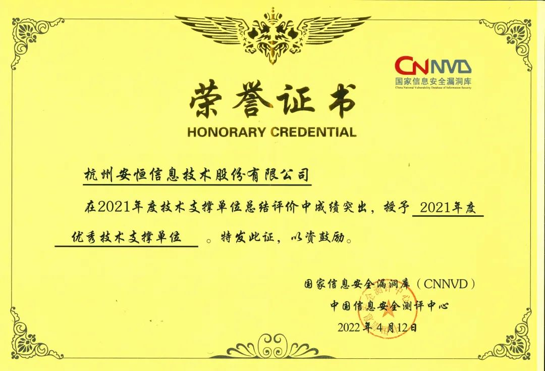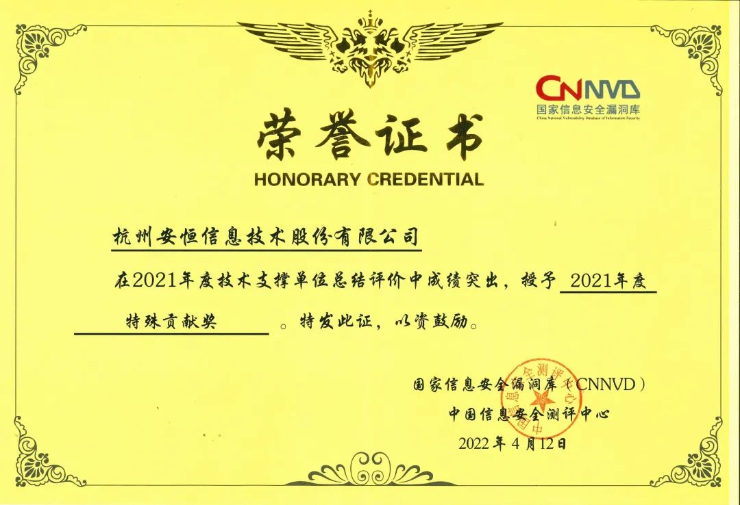 自2014年成为首批入选国家信息安全漏洞一级支撑单位的厂商以来,安恒信息积极为CNNVD提交重要数据漏洞,多年来,凭借实力和丰富经验先后获得来自CNNVD的多项荣誉。2021年,安恒信息荣获CNNVD颁发的“2021年度特殊贡献奖”“2021年度优秀技术支撑单位”,不断支持国家漏洞库的建设,助力信息安全漏洞研究。