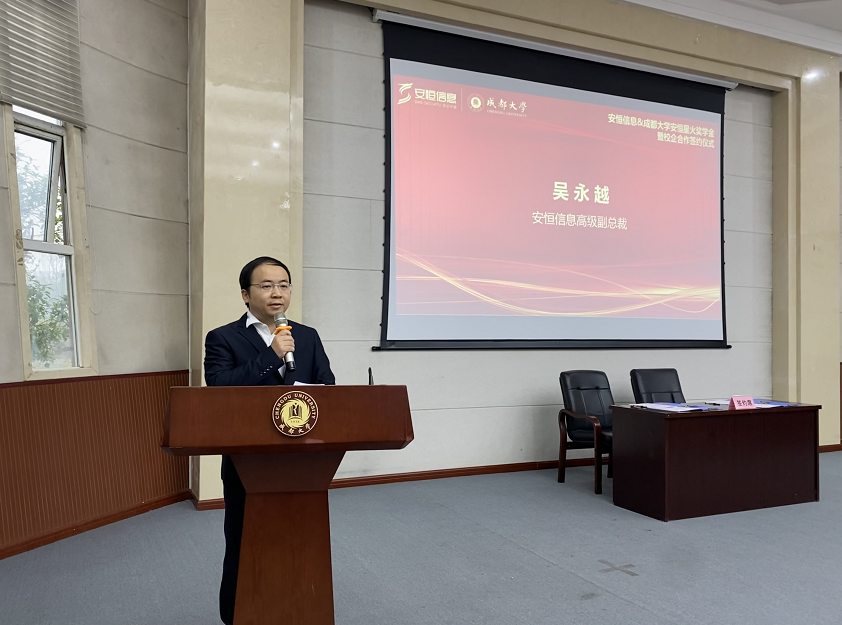 安恒信息高级副总裁、安恒公益基金会理事长吴永越在致辞中表示,这次签约是安恒信息联合高校打造创新联合体、深化合作的重要一步。成都大学不断推动人才培养模式创新,推进拔尖创新人才培养,深化创新创业教育,与安恒信息理念不谋而合。安恒信息也将通过慈善基金会,全方位践行行业建设与人才培养的社会责任与使命。
