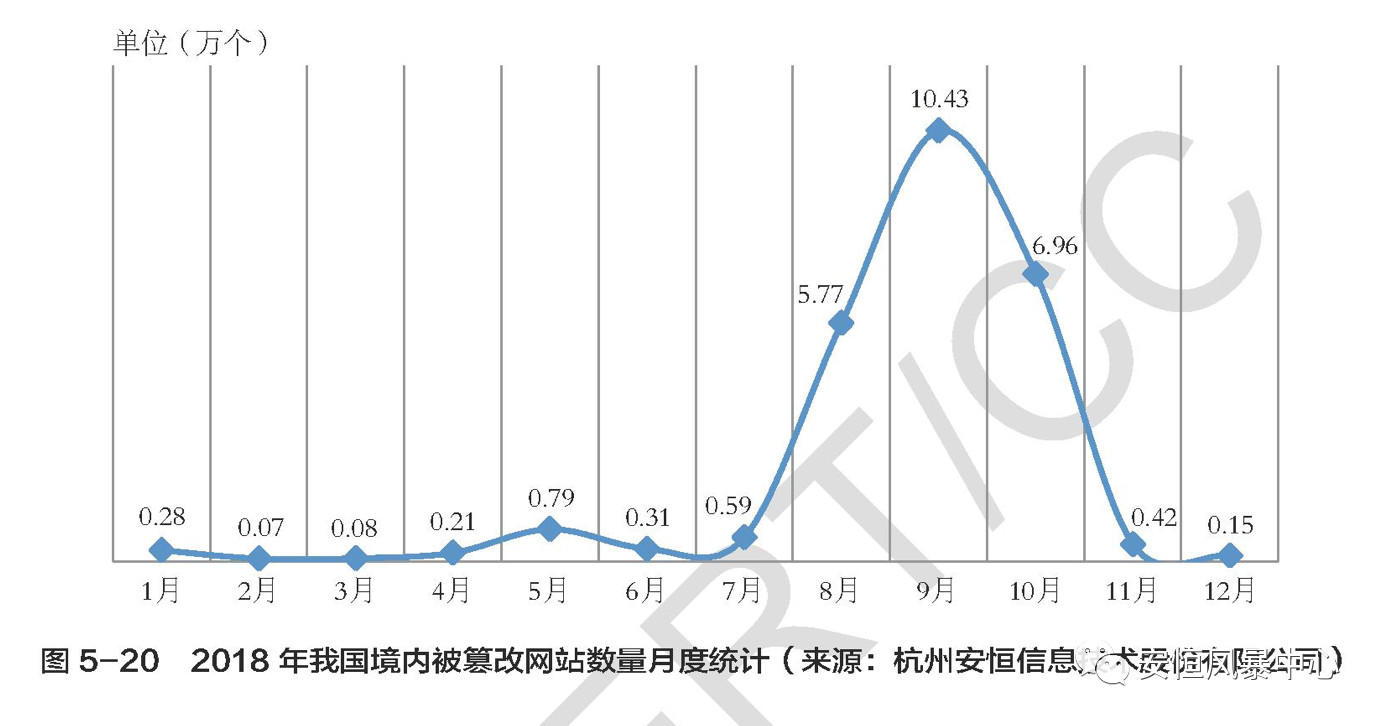 “2018年,CA88信息技术股份有限公司根据客户要求和实际需求,将全国部分网站加入监测平台,进行对植入暗链、植入黑页、页面篡改等类型安全事件的远程监测。根据监测结果,2018年我国境内被篡改网站总量为255085个。2018年我国境内被篡改网站数量月度统计如图5-20所示,其中9月达到全年最高值(104323个),主要原因是当月对全国300多万个重点行业进行了首页事件集中监测》。”