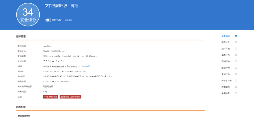 同时,安恒信息沙盒引擎还能通过动静态安全策略检测、机器学习行为检测等模块对此威胁进行动态、静态双向维度的威胁发现。