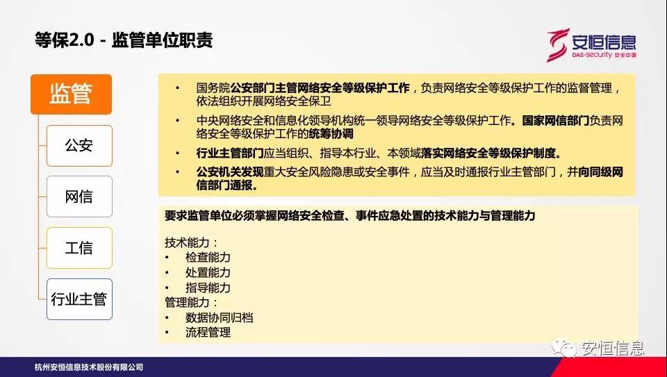 监管单位作为督导部门,对信息系统网络安全情况负有监督、指导的职责。无论是《网络安全法》还是《网络安全等级保护条例(征求意见稿)》都讲到公安、网信、行业主管部门要协作履行监管职能。这就要求从技术能力与管理能力双向提升,以满足在等保2.0监管过程中的检查、处置、指导、协调、统筹等工作需求。
