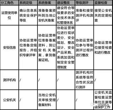 等级保护全生命周期各阶段工作及分工情况如下表所示: