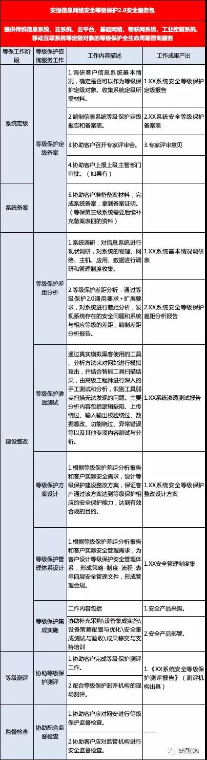 安恒等级保护咨询服务由如下服务包组成,服务包可根据需求组合拆分:
