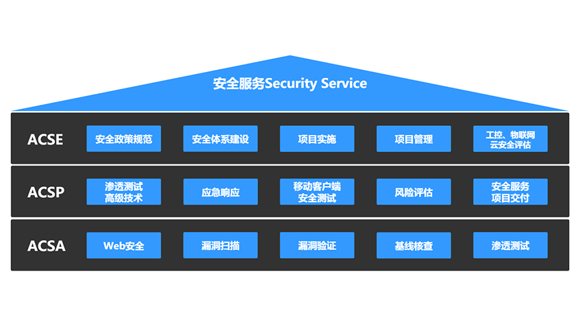 安全服务工程师(ACSA-Security Service)是以安全服务基础性工作任务为驱动,分解了相应的知识要求与技能要求,主要围绕Web安全、漏洞扫描、漏洞验证、基线核查、渗透测试等方面进行培养